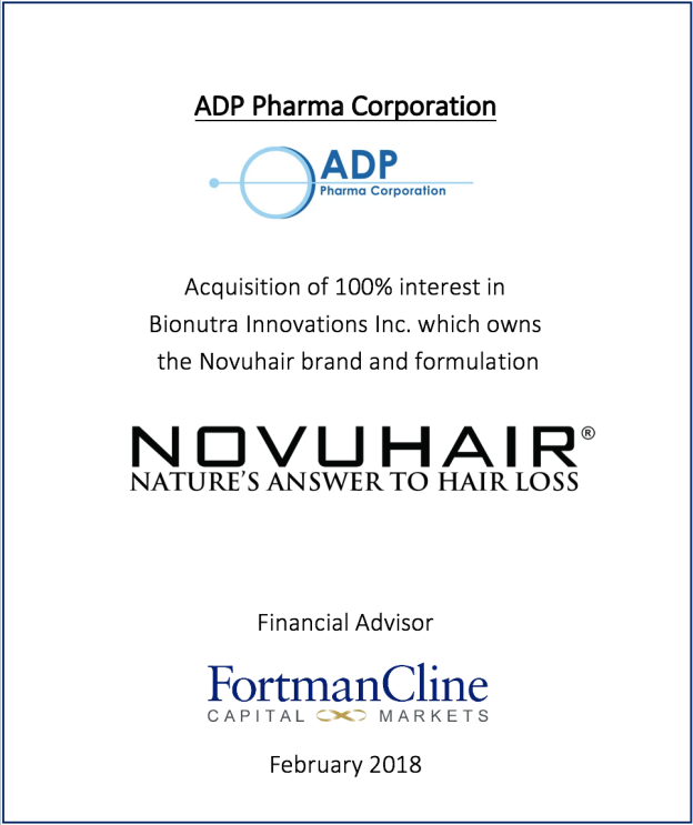 Fortman Cline advised the Pascual family in the acquisition of 100% of Bionutra Innovations Inc., the owner of the Novuhair brand and formulation. This acquisition expands ADP’s business into consumer wellness and cosmetics.