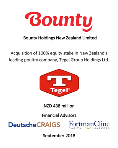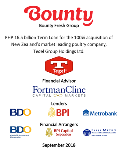 Fortman Cline advised the Bounty Fresh Group on its strategic options, which culminated in the NZD438 million cross-border acquisition and privatization by Bounty Fresh of then New Zealand-listed Tegel Group Holdings Ltd. Fortman Cline also advised Bounty Fresh on raising Php16.5 billion in acquisition finance from the three leading Philippine banks.